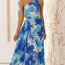 Lebhaftes abstraktes Muster – Das Kleid ist mit einem dynamischen Muster in Blautönen und lila Akzenten verziert, das an Aquarellmalerei erinnert und eine künstlerische und lebendige Ausstrahlung hat.